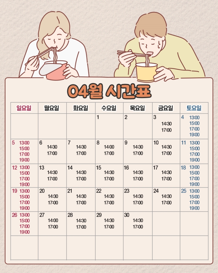 월~금 오후 2시30분, 5시 / 토, 일 1시, 3시, 5시, 7시