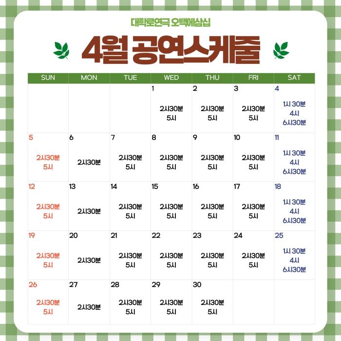 - 월 오후 2시30분 / 화, 수, 목, 금 2시30분, 5시 / 토 1시30분, 4시, 6시30분 / 일 2시30분, 5시