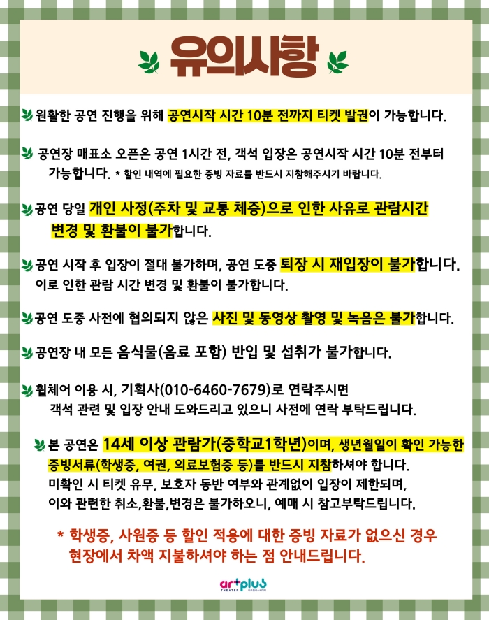 | 판매자(발행자) | 주식회사 아트플러스씨어터 | 고객문의(소비자상담) | 010-4549-7679 | ||||||