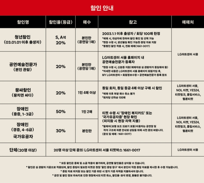 | 판매자(발행자) | LG아트센터 서울 티켓박스 | 고객문의(소비자상담) | 1661-0017 | ||||||