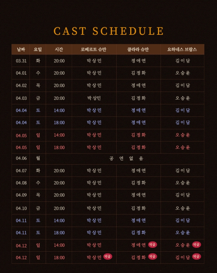 - 화~금 오후 8시 / 토, 일, 공휴일 2시, 6시
