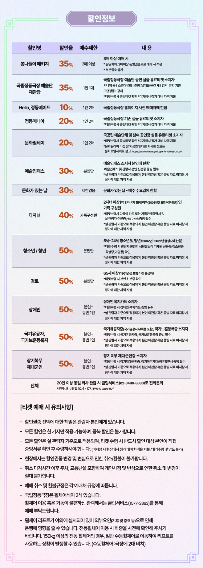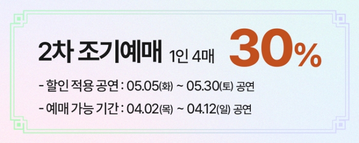 | 유효기간(이용조건) | 2026년04월03일(금) ~ 05월30일(토) (예매한 공연일시에 한해 이용 가능) | ||||||||