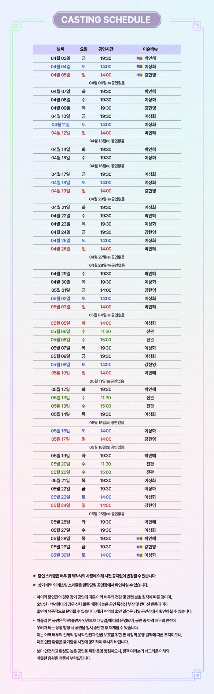 *월요일, 04.16(목), 04.28(화), 05.15(금) 공연없음