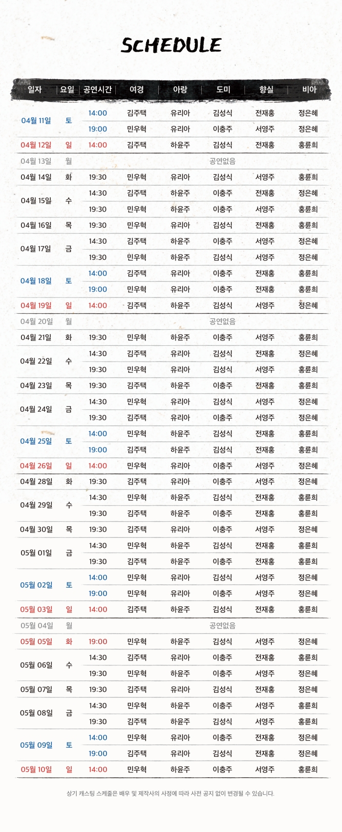 - 화, 목 오후 7시30분 / 수, 금 2시30분, 7시30분 / 토 2시, 7시 / 일 2시 (월 공연없음)