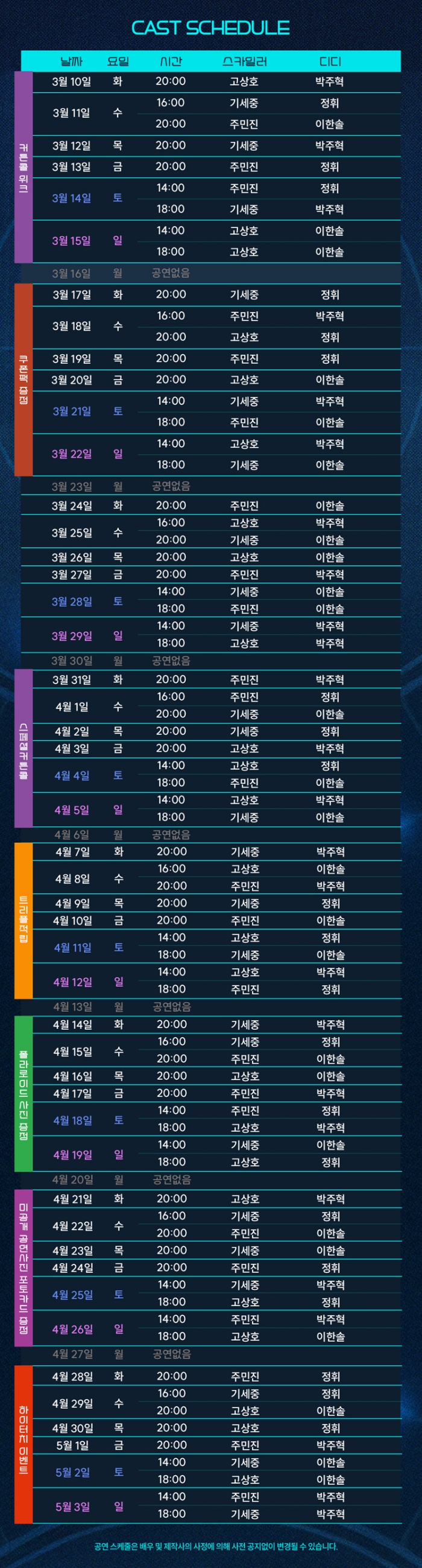 화, 목, 금 오후 8시 / 수 4시, 8시 / 토 일, 공휴일 2시, 6시 (월 공연없음)